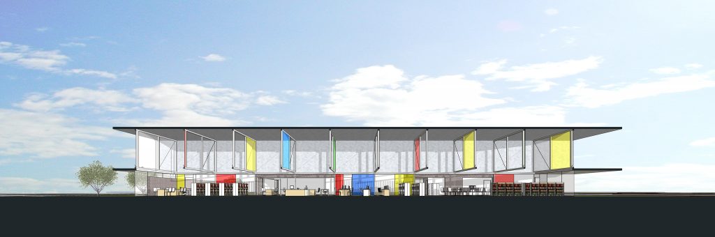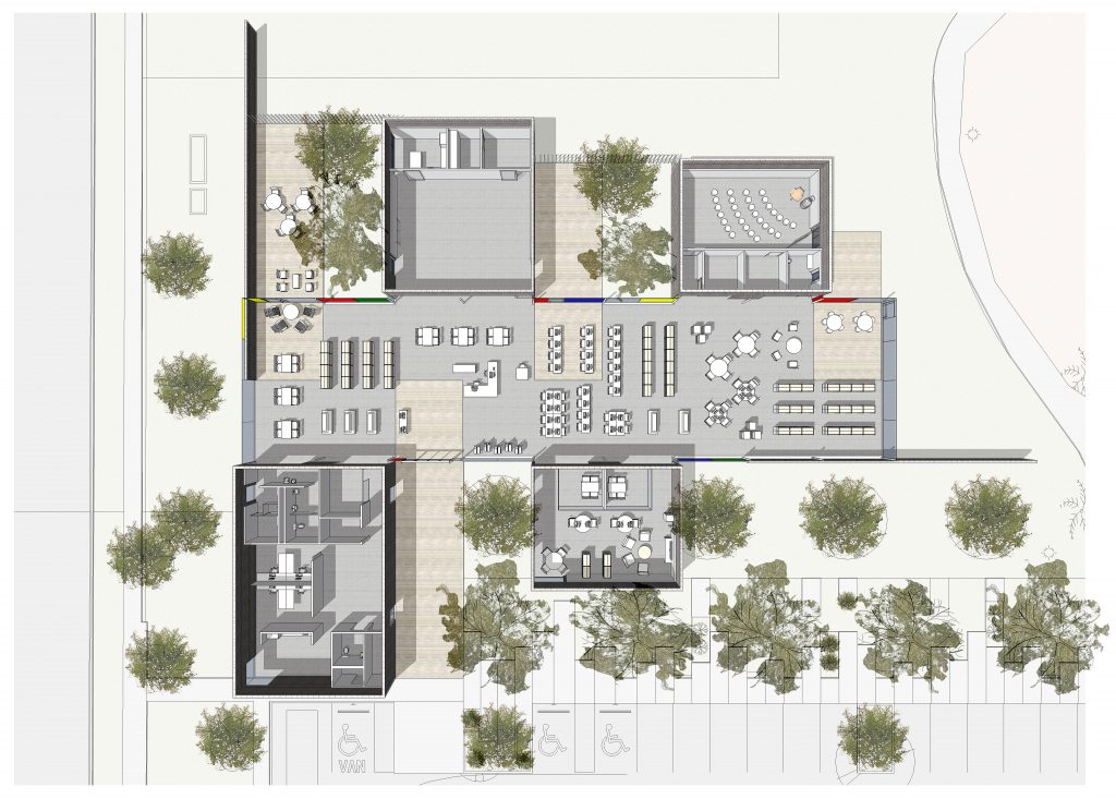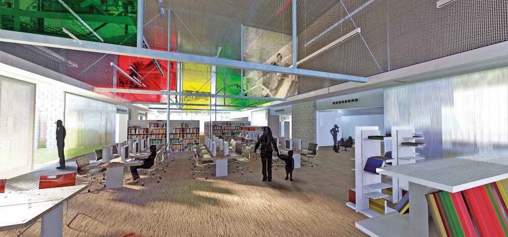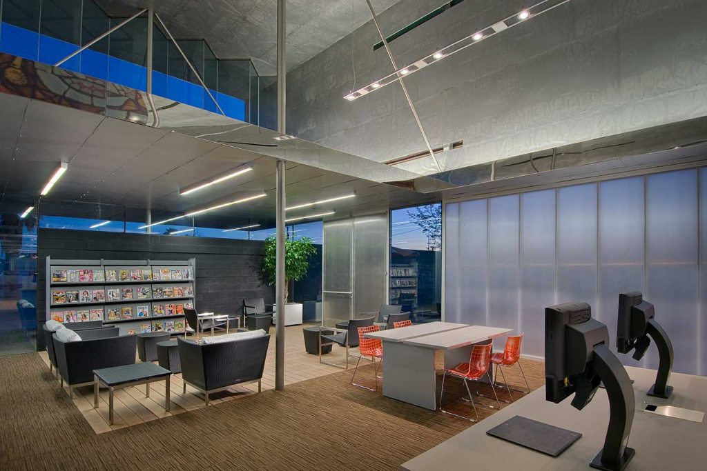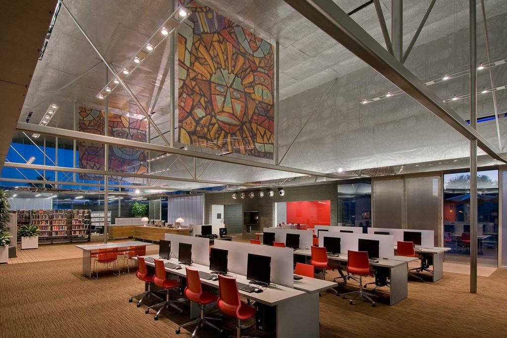 Framed with a large expanse of saw-tooth glass, the upper ceiling volume is sheathed in perforated aluminum panels, dispersed with colored linear skylights and slot windows that refract the ever-changing light throughout the day. An open floor plate transfers patrons throughout the library and augments views to exterior garden courts and the adjacent community park beyond.