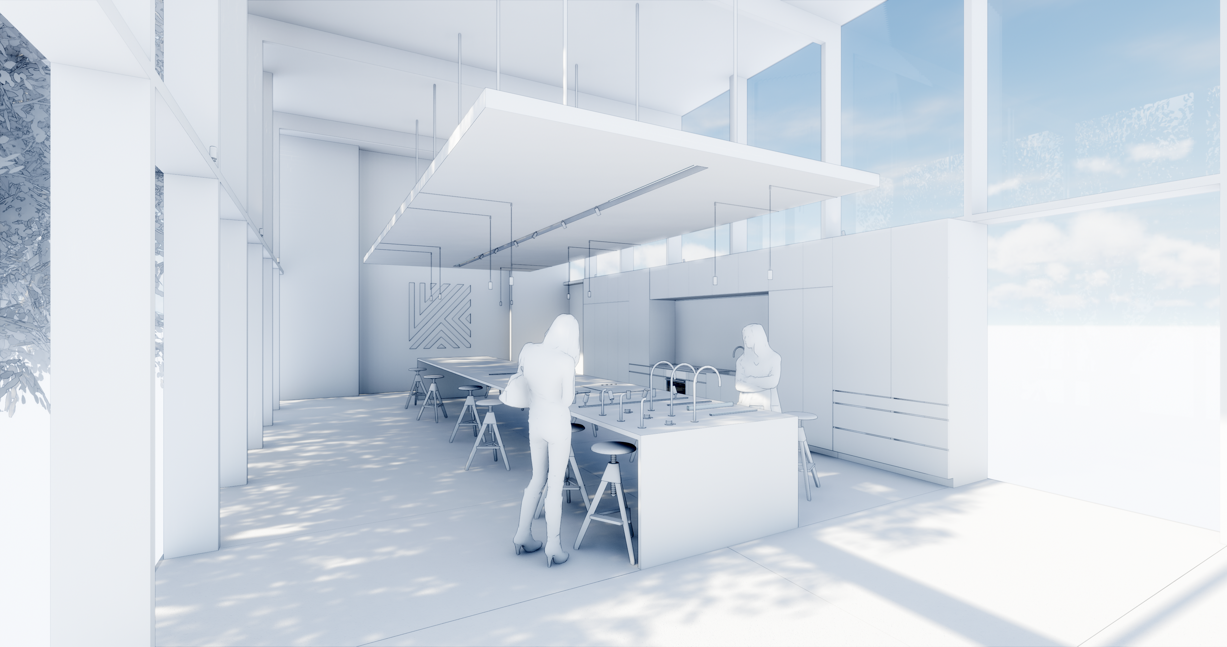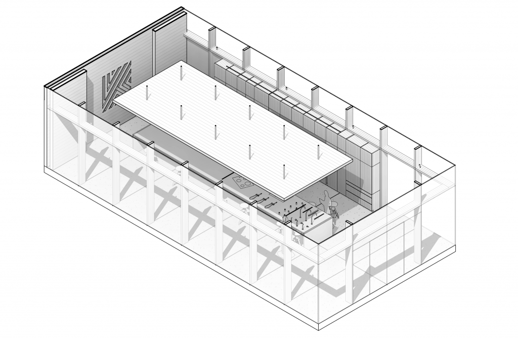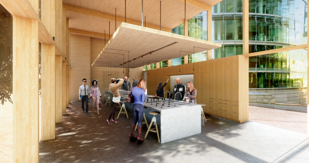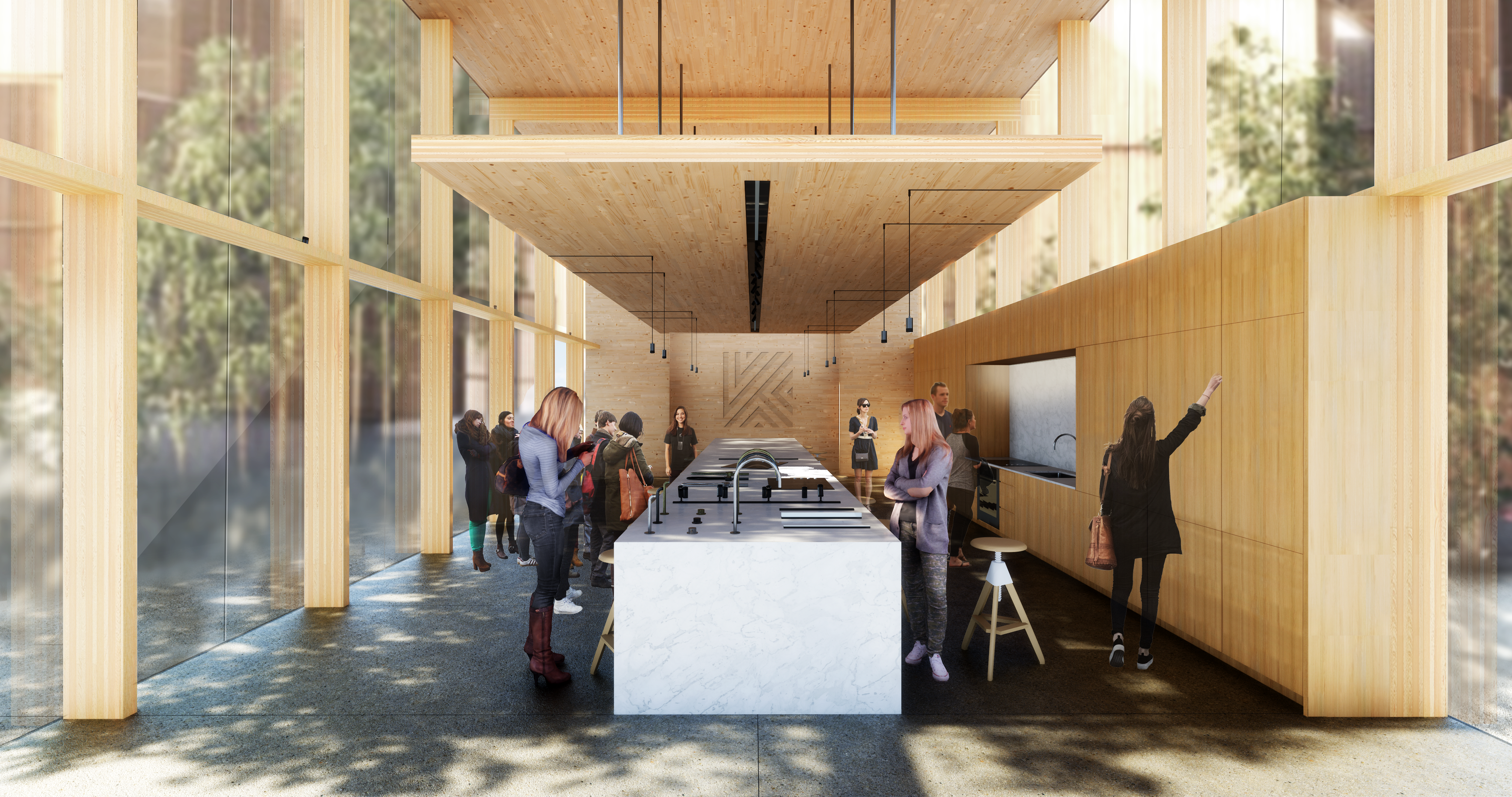 The architecture of the space featured heavy use of Cross Laminated Timber (CLT), wide open glass storefront, and a suspended panel of CLT. Conceptually the space was imagined at the base of a mixed-use commercial or luxury residential building.
