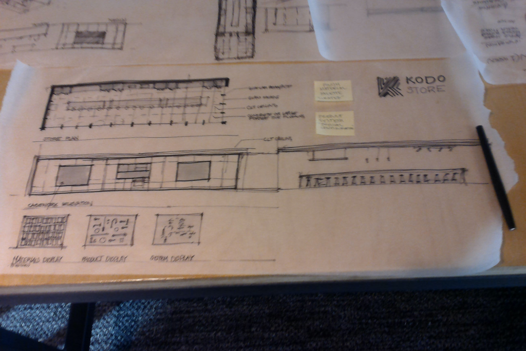 The KODO brand and product lines were well underway by time we started work on the pop-up concept. The stylish and exhaustive Branding below was created by Julie Adams, both a dynamo and tenacious creative. The clean and elegant brand work easily translated into architectural details within the space, such as the CNC’d logo within the mass timber panels.