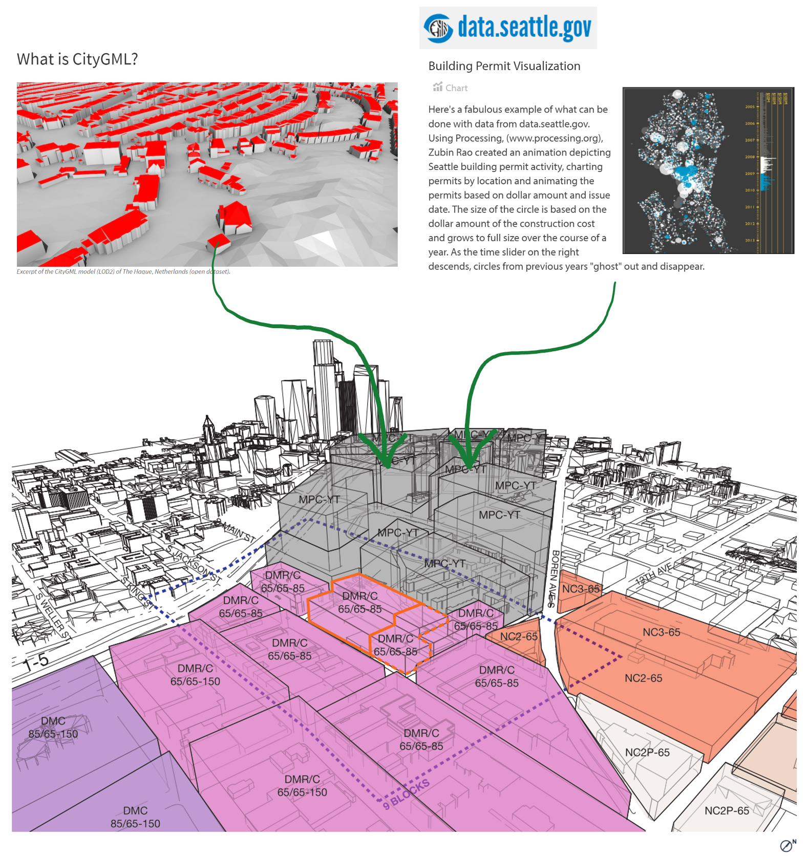 The goal of this hackathon project is to enable the general public to more easily understand public policy on the built environment. This improved understanding is facilitated through Augmented Reality visualized open-source data sets. Land, building, and infrastructure masses can be harvested from open data sets such as CityGML, while zoning, economic, and other jurisdictional information can be found on local datasets such as Data. Seattle and Walkscore, et. al. We proposed to access this data and visualize it through AR onto a given property in order to give insights to the general public about their neighborhood’s future, and to investors for the development potential of a property.