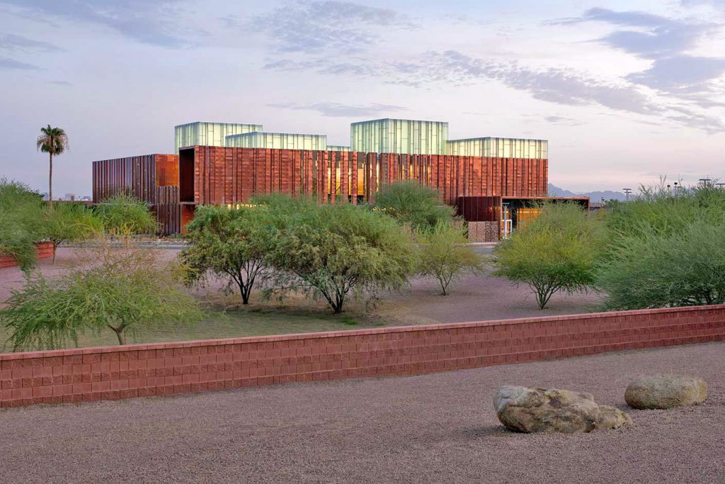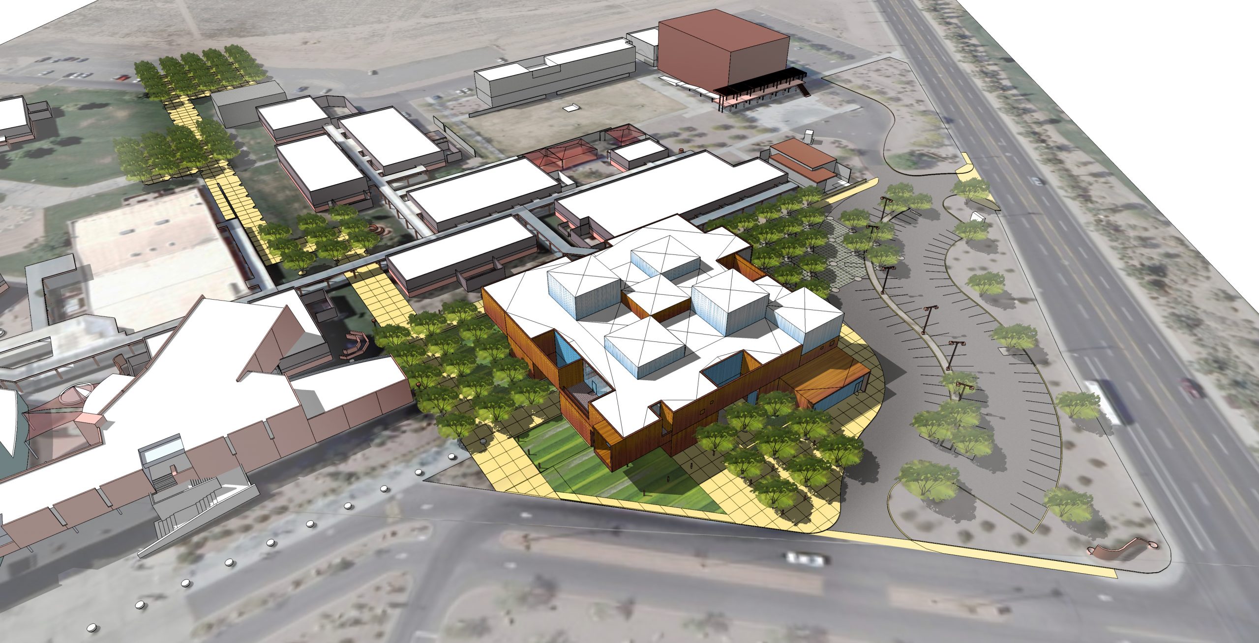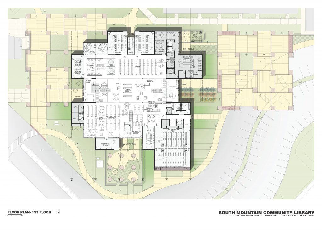 Academic/public library for South Mountain Community College (SMCC). The design takes inspiration from the site’s agricultural past and its technology-focused future. The floor plan, similar to a veined fruit or microchip, has a central processing chamber that distributes to surrounding functional areas.